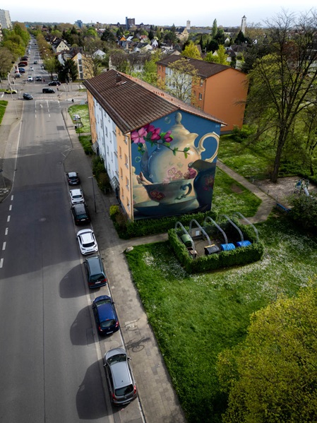 Die polnische Künstlerin setzt in ihrer Bildsprache Frauenfiguren in den Fokus. Als hyperrealistische Nymphen und Feen, umgeben von Fabelwesen und magischen Landschaften, werden sie auf Fassaden in der ganzen Welt gebannt. Im Mural in der Hochfeldstraße badet eine solche Nymphe in feinem Meißner Porzellan, als wäre sie der Geschichte von Alice im Wunderland entsprungen. (Broschüre Muralu)