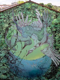 Auf meine Frage an Julia, wie weit sich die beiden an ihre Skizzen halten: "Nur grob! Das Gesamtwerk ist zwar klar vorgegeben, aber die Intuition während der Arbeit ist ein wichtiger, künstlerischer Gesichtspunkt; ohne diese Freiheit wäre es ja nur ein Abmalen..." Und wer ist für welche Arbeiten an einem solchen Werk 'zuständig'? "Fred übernimmt meist die Parts mit Graffiti-Elementen und der Natur in allen Formen. Den Hintergrund gestalten wir meistens zusammen, während ich mich dann auf Tiere konzentriere und er sich auf die Elemente aus Natur und Ornamentik." "Ja", ergänzt Frederic, "in meiner Jugend war ich dem Graffiti verfallen. Wie viele andere auch musste ich oft dafür büssen, weil wir einfach keine genehmigten Flächen hatten, um unsere Kunst auszutoben. Heutzutage ist das glücklicherweise anders: Graffiti ist wie die Fassadenmalerei eine anerkannte Kunstform geworden, die in der ganzen Welt Beachtung findet." Er weist noch darauf hin, dass er sogar einmal nach Kirgisistan eingeladen wurde, um eine Arbeit vorzuführen: "Ohne Bezahlung zwar, aber auch ohne jegliche Ausgaben..." und zwinkert dabei fröhlich.