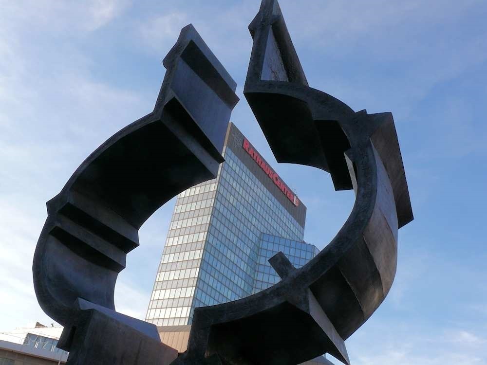 Bronze, 5 m hoch. Symbolischer Zugang zur Fußgängerzone.